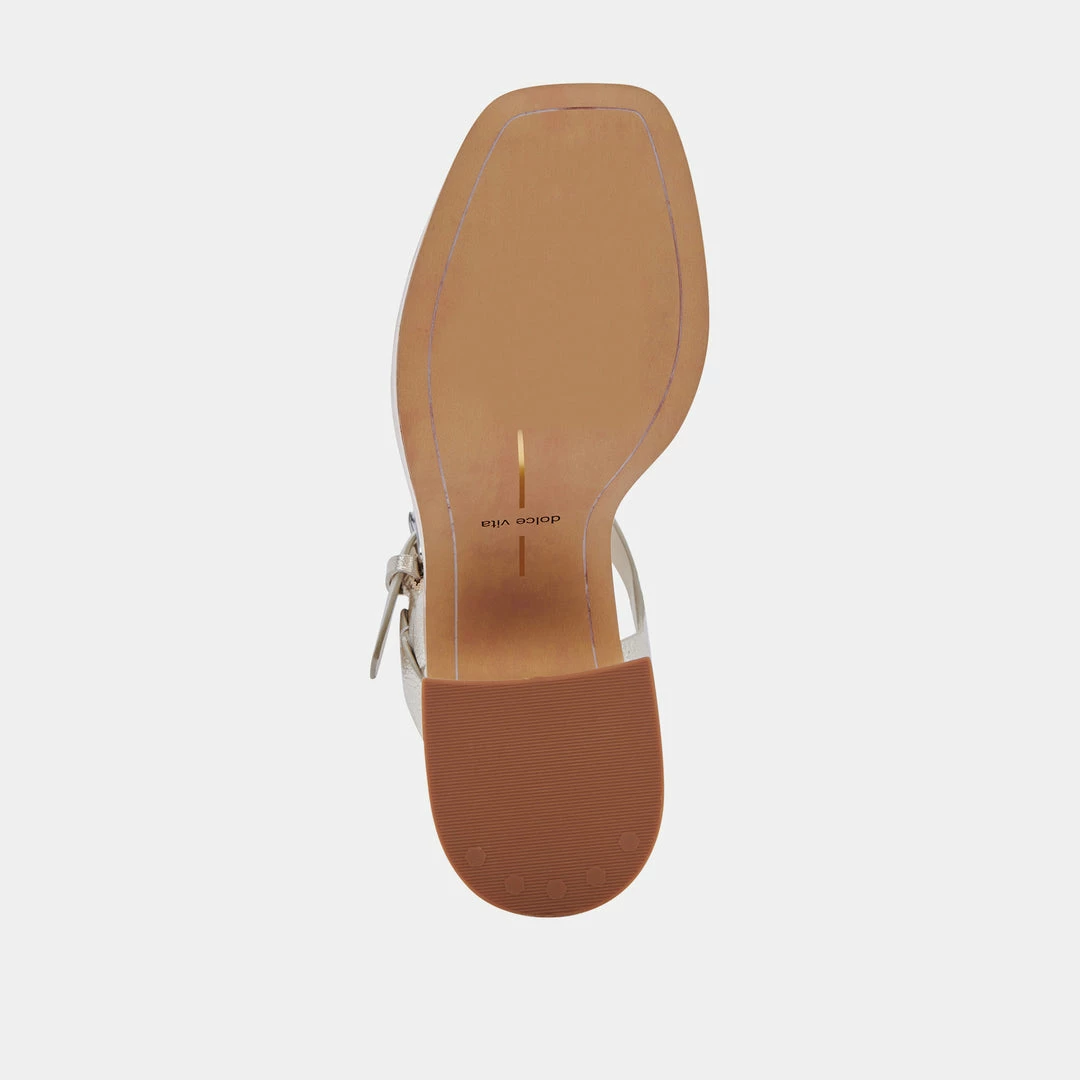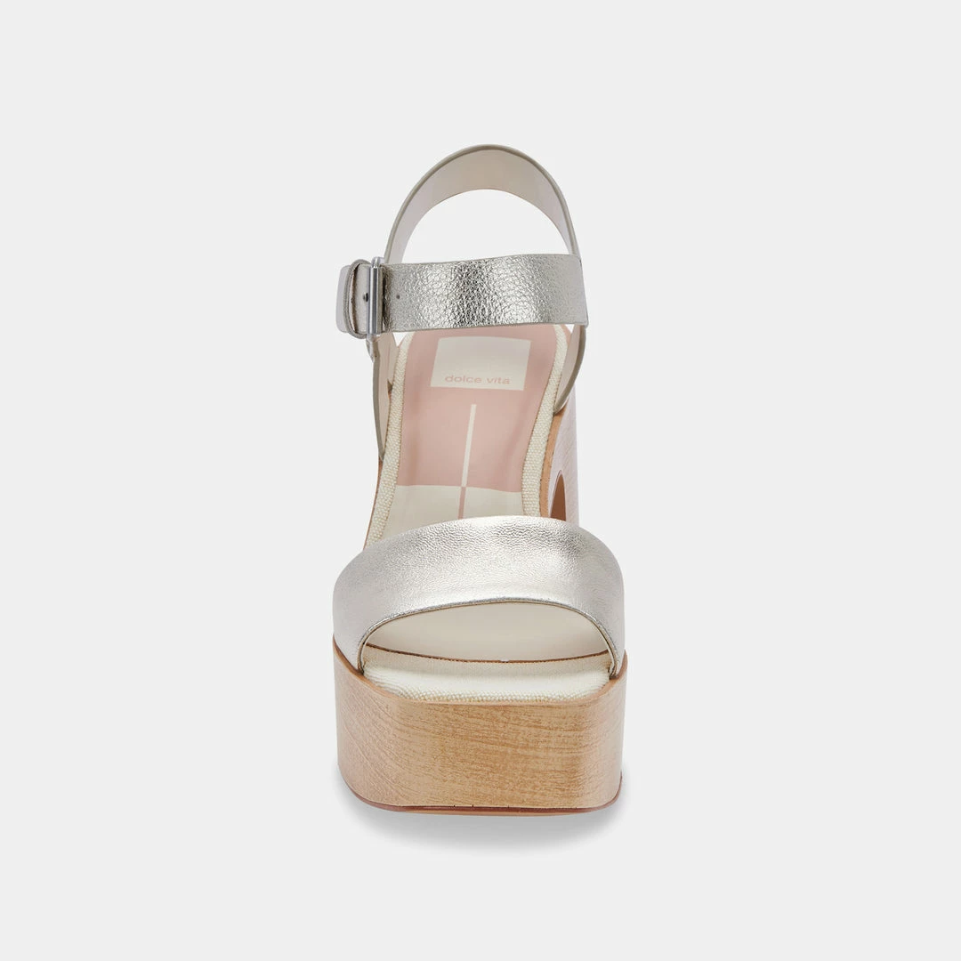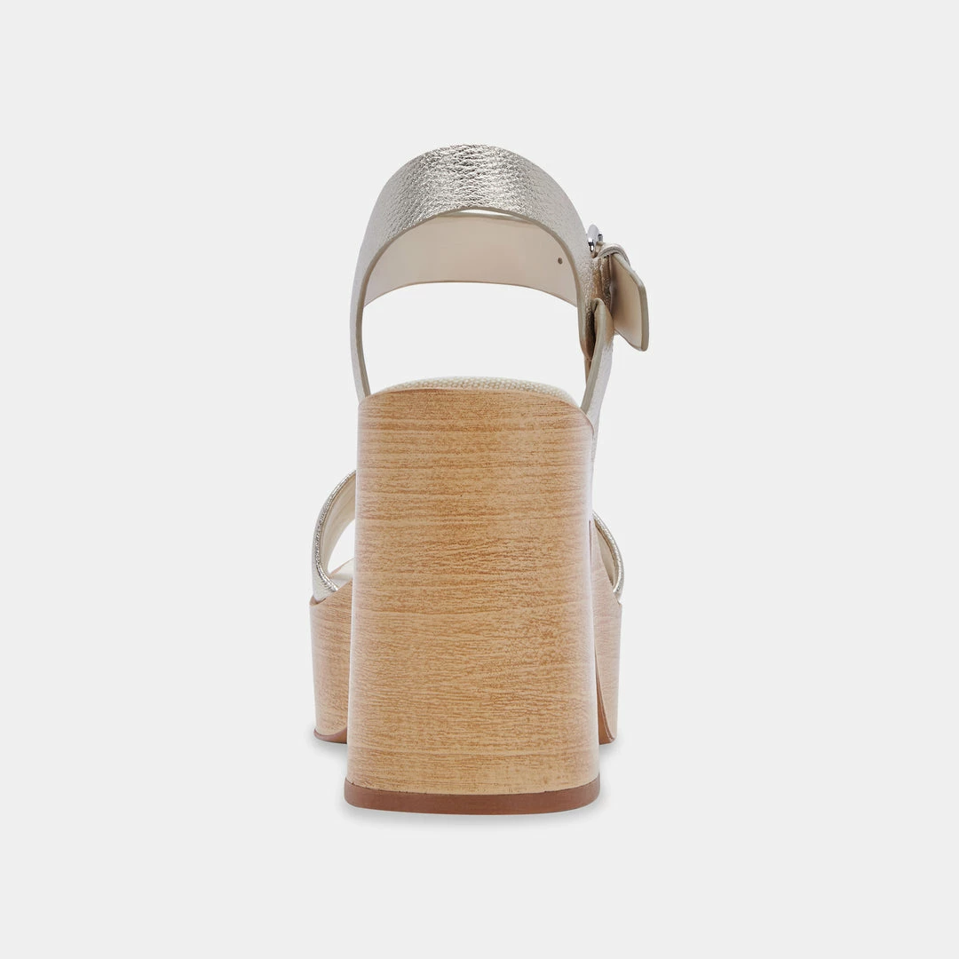 Sometimes, you just want to “go big”. WALLIS pairs a chunky platform sole with sky-high heels, all crafted in this season’s retro-chic woodgrain motif. An exaggerated ankle strap and buckle complete this throwback look.